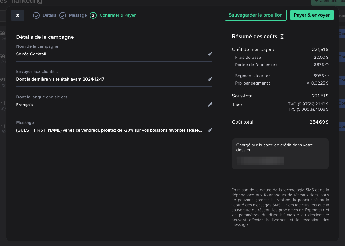 Par défaut, les frais de marketing par SMS seront facturés sur la même carte que votre abonnement. Vous pouvez modifier la carte de crédit utilisée pour les campagnes de marketing par SMS dans le back-office.