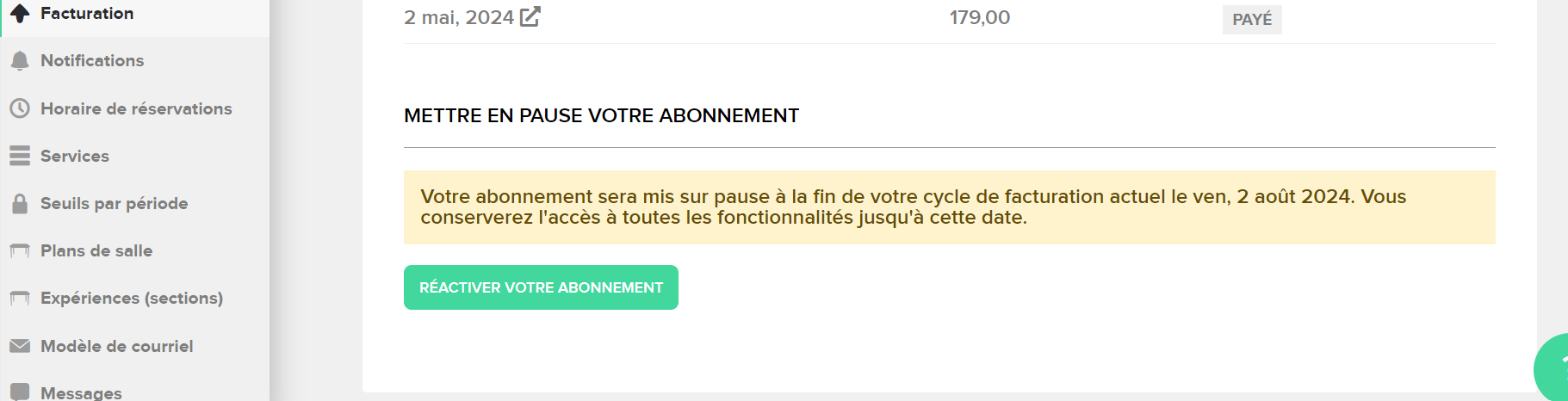 Lorsque vous mettez votre abonnement en pause, vous continuerez à avoir accès à toutes les fonctionnalités jusqu'à la fin de votre cycle de facturation en cours. Par la suite, vos frais d'abonnement réguliers seront suspendus et vous serez facturé 35$ par mois. Vous pouvez reprendre votre abonnement complet à tout moment en cliquant sur le bouton de réactivation.