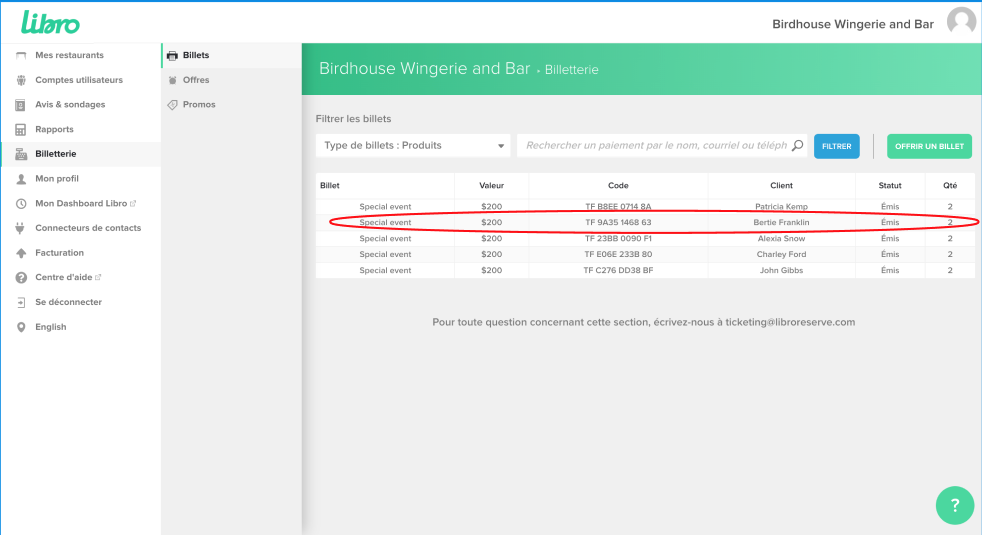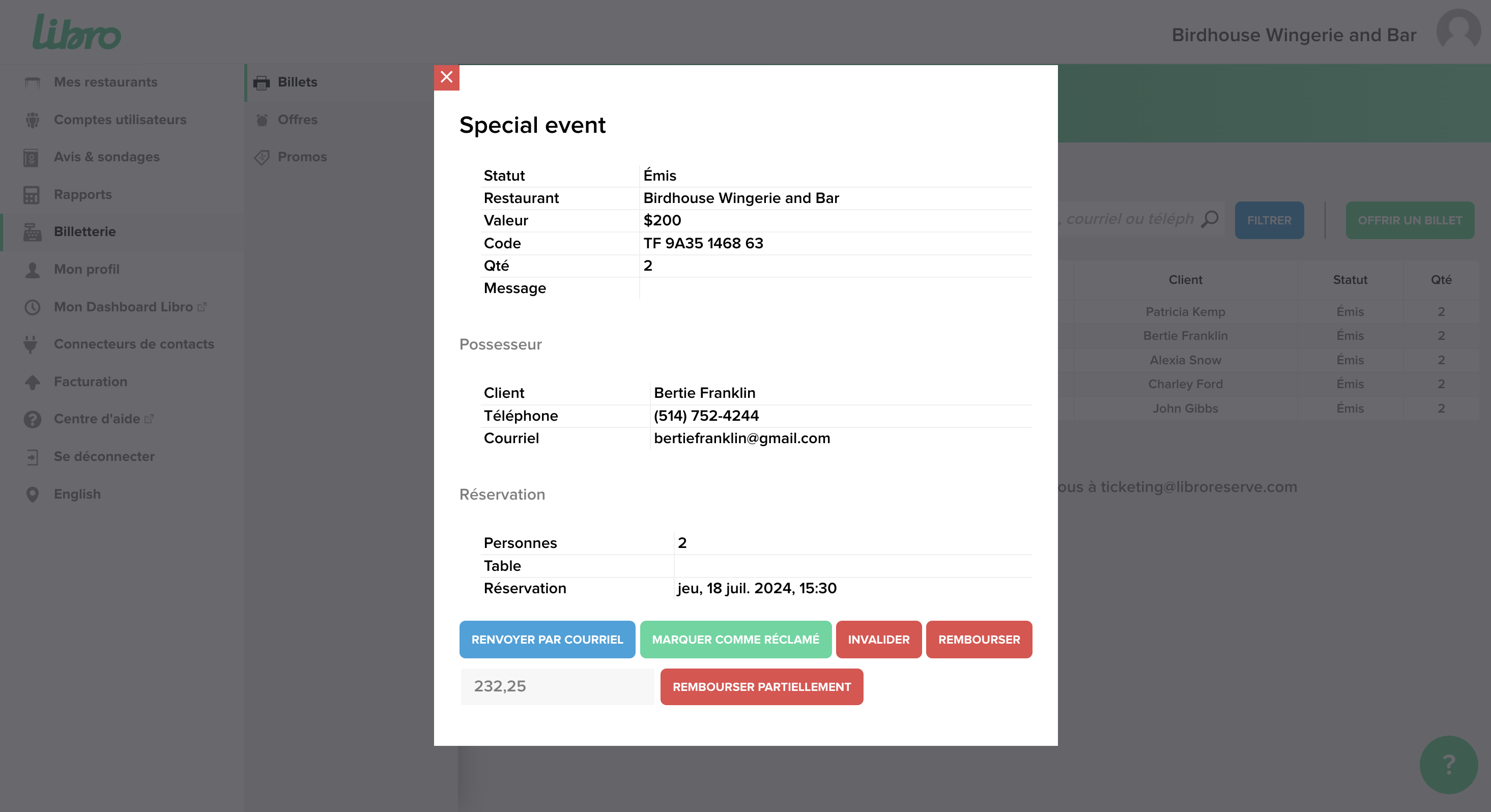 Lorsque vos clients achètent un billet lors de leur réservation, ils ne peuvent plus annuler leur réservation en ligne. Pour demander un remboursement, ils doivent vous appeler directement au restaurant. Voici comment procéder pour émettre un remboursement partiel ou total via le Back Office de Libro :